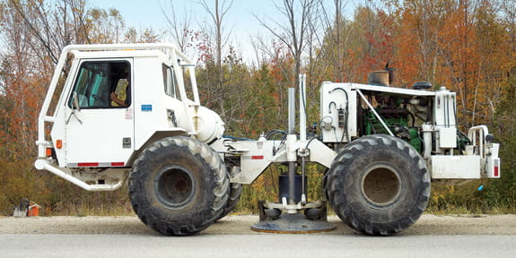The technique uses sound waves that travel through the ground and are reflected at boundaries between rock layers. A vibroseis truck is used to transmit vibrations into the ground. The vibrations are generated by a vibrating plate that is lowered from underneath the truck and pressed against the ground surface.