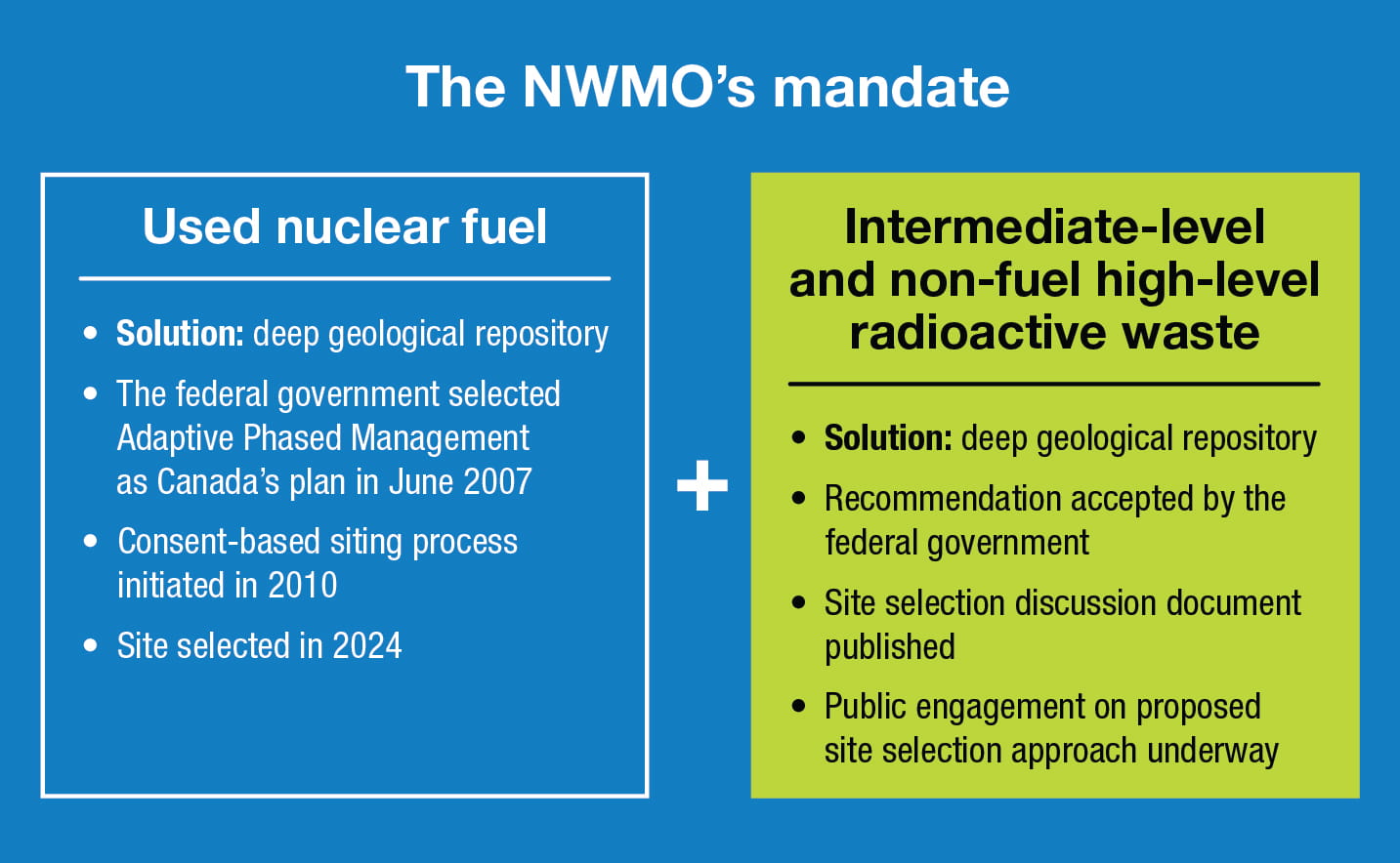 While separate from the organization’s ongoing efforts to implement a deep geological repository for the long-term disposal of used nuclear fuel, this new work will benefit greatly from the NWMO’s expertise and past lessons learned.
